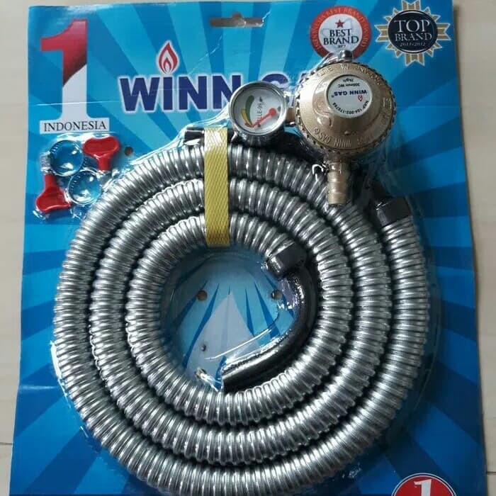 Winn Gas Paket Regulator. Selang flexible W68 M merupakan selang gas fleksibel yang telah lulus uji coba anti kebocoran gas. Selang gas ini memiliki regulator sebagai katup untuk membuka atau menutup aliran gas yang dipasang di kepala tabung gas. Panel meter yang terdapat pada selang ini dapat menjamin regulator terpasang sempurna. Dengan panjang 1.8 meter, Selang gas ini sangat aman untuk digunakan pada kompor gas Anda di rumah.Detail:- Regulator selang gas fleksibel- Dilengkapi dengan panel meter untuk menjamin regulator terpasang sempurna- Memiliki panjang 1.8 meter- Telah lulus uji coba anti kebocoran gas- Regulator mudah dipasang dan diganti- Hemat gas dan aman digunakan sehari