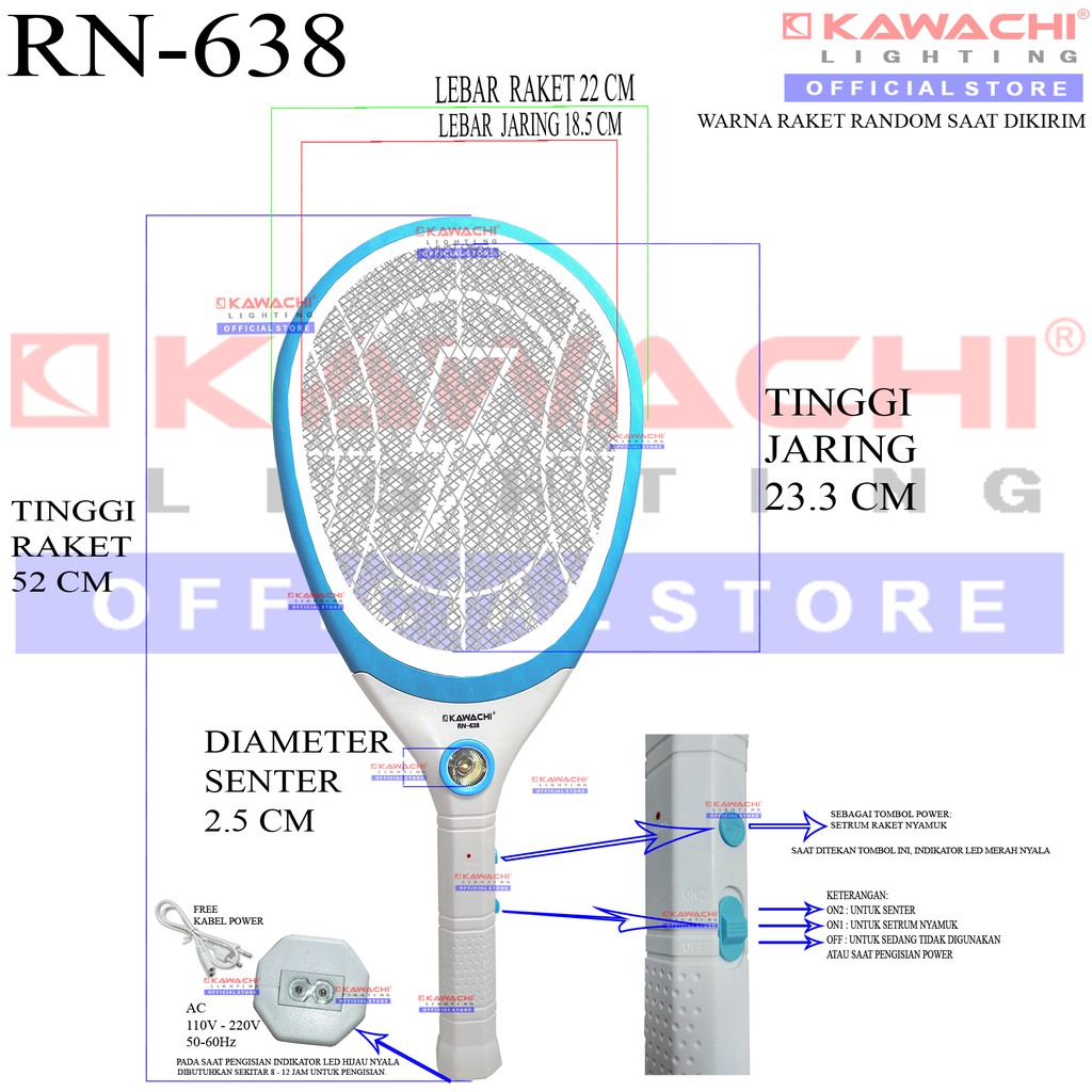 Raket Nyamuk Premium Quality Kawachi RN-638Tegangan keluar : 3000VTegangan masuk : AC110 - 220V/50-60Hz#Nyamuk #lalat #kecoa #serangga #kecil #BAYGON #HIT #KUAT #TAHAN #LAMA #RAKET #SPECTRA #BUNUH_