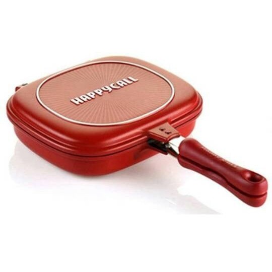 HAPPYCALL 32 Cm[Original Made in Korea]Super Jumbo Size 32 x 24 cm* Ada No. PAT* Karet Seal CadanganSpesifikasi:1. Sistem Pengunci Magnetik (magnetic locking mechanism /handle)2. Pegangan Stainless Steel (stainless steel holder)3. Karet Segel Silicon (silicon seal packing)4. Tempat penampung minyak /uap air5. Engsel Penahan (hinge joint /oil receptacle)6. Lubang uap (steam vent /port)7. Alur menonjol (grooved rim)8. Gagang Anti Panas (controured head resistant handle)Happy Call Double Pan memiliki 2 sisi permukaan untuk memasak dengan perangkat karet segel silikon (Dow Corning, USA) dengan gagang bermagnetik, hingga:* Menghasilkan pressure tinggi, proses masak menjadi lebih cepat 30-40%* Tidak tumpah saat masakan dibolak-balik* Hasil Optimal &Maksimal, olahan ikan dan daging terasa lembut didalam dan crispy diluarManfaat Happy Call antara lain:* Memanggang ikan, udang, aneka seafood, steak, sate, martabak, pizza, cake.* Mengolah nasi goreng dari beras, aneka tumis sayuran hingga popcorn dengan sempurna.* Dapur bersih bebas percikan minyak.Tanpa asap dan bau.* Dilengkapi dengan tiga lapisan keramik special ceratinum coating menjadikan permukaan bebas lengket, hanya membutuhkan sedikit minyak. Kuat dan tahan lama serta mudah dibersihkan.* Mengatasi problem memasak ikan! (tanpa percikan minyak)* Sajian lebih nikmat dan kaya giziREAL PICT YA KAK