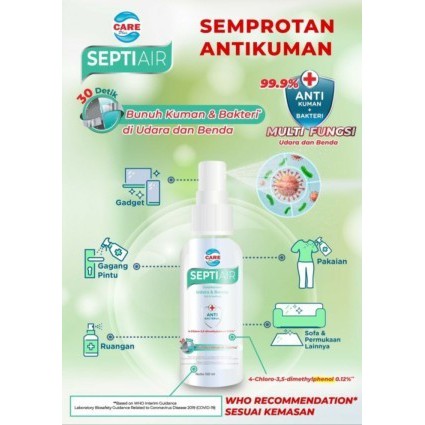 ANTISEPTIK CAREPLUS SEPTIAIR DISINFECTANT ANTI BACTERIAL 100 MLSepti Air Cairan Semprot Multiguna, mengandung 4-Chloro-3,5-dimethylphenol yang berfungsi untuk membunuh bakteri dan kuman di udara dan permukaan benda dalam 30 detik.Petunjuk Pemakaian :Semprotkan secara merata ke dalam ruangan dan permukaan benda untuk membunuh bakteri dan kuman.Dapat juga di semprotkan pada rusangan kosong selama 5-6 detik kemudian diamkan selamaz 10 menit.Dapat digunakan untuk :- Daerah Kamar Mandi- Di Dapur- Tempat Penyimpanan- Gagang Telepon / Handphone- Ruang Bermain Anak, Ruang KEluarga, Kamar Tidur- Kasur / Seprei- Dalam