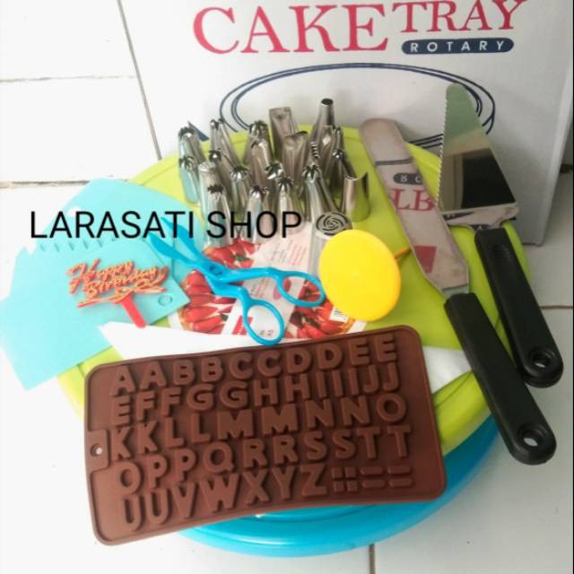 Isi paket cake tray meja putar warna random spuit set wilton lokal scraper set 3 motif cetakan coklat silicon alphabet spatula bengkok spatula polos spuit rusia import motif random paku mawar plastik gunting mawar topper happy brithday plastik segitiga piping bag.Happy baking happy shopp