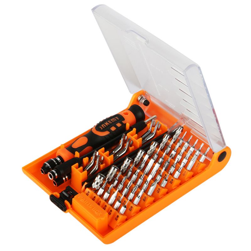 Overview of Jakemy 54 in 1 High Grade Screwdriver Set - JM-8150Obeng Set Wajib Punya Jakemy JM-8150 Screwdriver Set hadir dengan 50 jenis kepala obeng dengan kualitas besi yang kuat dan tahan lama. JM-8150 dilengkapi dengan kotak untuk menyimpan kepala obeng dengan design yang ringan, dan mudah dibawa kemana saja.FITUR54 in 1 Bits Mata Obeng Jakemy JM-8150 cocok untuk Anda yang memerlukan kepala obeng dengan berbagai jenis namun tetap mudah untuk dibawa kemana saja.Bahan Awet dan Tangguh Semua perlengkapan dari jakemy terbuat dari material 6150 CR-V yang merupakan besi dengan kualitas terbaik. Memastikan peralatan kerja Anda tahan lama dan awet dalam penggunaan sehari-hari.Fitur Magnetik Obeng jakemy JM-8150 memiliki perekat magnet yang sangat kuat, memastikan setiap mata baut dapat tertempel dengan kuat saat digunakan.KELENGKAPAN PRODUK Barang-barang yang Anda dapatkan di dalam box :50 x Bits1 x Shaft Extension1 x Flexible Shaft Extension1 x Screwdriver Han