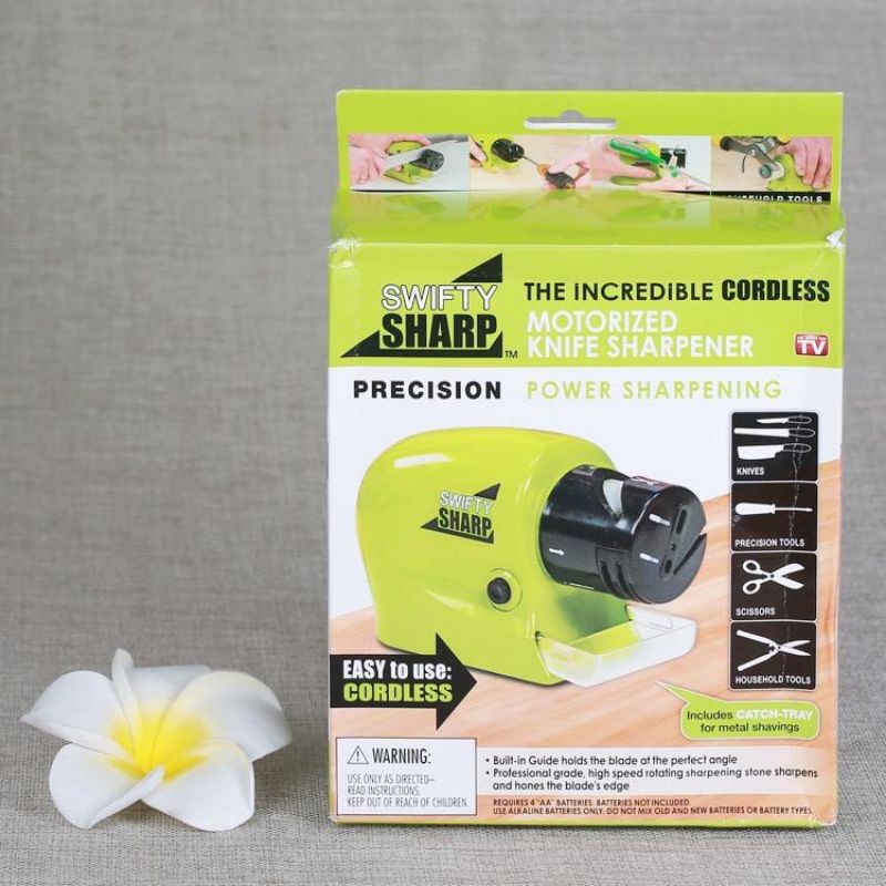 Swifty Sharp Alat Pengasah Pisau OtomatisDeskripsi Swifty Sharp /Alat Pengasah Pisau Elektrik Otomatis/ Asah PisauSwifty Sharp Electric merupakan pengasah multifungsi yang dapat digunakan untuk mengasah pisau berbagai ukuran dan obeng. Menggunakan tenaga elektrik sehingga Anda tidak perlu capek mengasah pisau secara manual.Electric SharpenerPengasah menggunakan 4 buah baterai AA sehingga pengasah ini dapat bergerak secara otomatis. Anda tidak perlu kelelahan lagi mengasah pisau secara manual.Multi Function SharpenerBerbagai ukuran pisau dapat diasah dan juga dapat mengasah obeng.Easy Way To Sharpener KnifeCukup letak pisau ke slot pengasah yang tersedia dan tekan tombol power untuk menyalakan pengasah ini. Ampas pisau tertampung pada bagian bawa sehingga tidak berserakan dan mudah dibersihkan.Berat