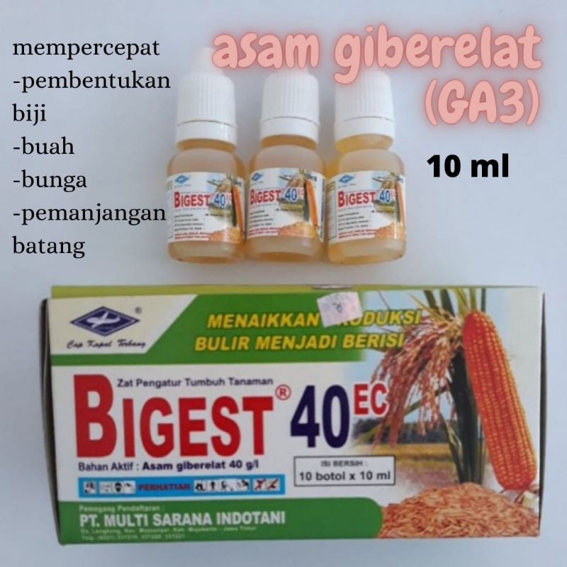 Bigest 40 EC 10 mlZat pengatur tumbuh tanaman. Menaikkan produksi bulir menjadi berisiBahan aktif : asam gilberalat 40 g/lProduksi Cap Kapal TerbangJagung :- meningkatkan tinggi tanaman- meningkatkan jumlah daun- meningkatkan panjang dan lebar, warna dan bobot kering pipilan- meningkatkan diameter batang- meningkatkan bobot tongkol ubinan- meningkatkan bobot 100 butir jagungJeruk : - meningkatkan pembentukan buah- meningkatkan besar buah- meningkatkan berat buah- meningkatkan produksi buahPadi : - meningkatkan tinggi tanaman- meningkatkan jumlah anakan produktif- meningkatkan hasil gabah kering panen/rumpunTeh : - meningkatkan hasil pucuk basahMentimun : - meningkatkan tinggi tanaman- meningkatkan jumlah bunga dan buah- meningkatkan hasil buah- meningkatkan hasil produksiSatu box isi 10 ampul 10ml #bigest40EC# #bigest10ml# #bigestgrosir# #zatpengaturtum