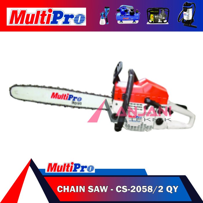 Deskripsi MULTIPRO CS-2058/2QY MESIN GERGAJI POHON KAYU 20 INCH CHAINSAW CS2058PRODUCT NUMBER : 9.CS2.258.2QYSPESIFIKASIEXPERT SERIES- ENGINE : AIR COOLED , 2-STROKE , 1 CYLINDER- DISPLACEMENT : 58 CC- POWER : 2.4 KW- IDLE SPEED : 2800 - 3000 RPM- HIGH SPEED : 11500 RPM- FUEL / OIL MIXED RATIO : 25 : 1- FULL TANK CAPACITY : 550 ML- OIL TANK CAPACITY : 260 ML- CHAIN PICTH : 0.0325"- BAR SIZE : 20"- NETT WEIGHT : 6.5 Kg- GROSS WEIGHT : 7 Kg- DIMENSIONS : 51.5 x 26 x 27 Cm- COLOR : ORANGE & COOL GREYGaransi MULTIPRO 1 Tahun Pertama Servis + 6 Bulan Pertama Spare