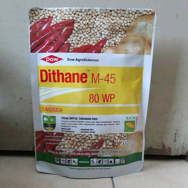Bahan Aktif : mankozeb 80 %Dithane M-45 termasuk fungisida kontak yang berfungsi melindungi tanaman dari serangan jamur lebih lanjut. Ia membentuk lapisan tipis pada permukaan tanaman dan secara perlahan mengeluarkan senyawa tertentu yang mengganggu aktivitas pernafasan jamur. Dithane M-45 mencegah pembentukan spora pada jamur sehingga tidak dapat menyebar.Beberapa penyakit jamur yang dapat dikendalikan oleh dithane M-45 diantaranya adalah busuk daun, bercak daun, busuk buah, cacar daun , gugur daun, bercak ungu, mopog, karat daun, dan busuk batang.Petunjuk PenggunaanSemprotan harus diarahkan kepada semua bagian tanaman secara merata. Penambahan 2-4 ml Latron 750-L per 10L larutan sangat dianjurkan untuk mendapatkan hasil pengendalian yang lebih sempurna terutama pada musim hujan. Untuk tanaman pangan, penyemprotan terakhir adalah dua minggu sebelum dip
