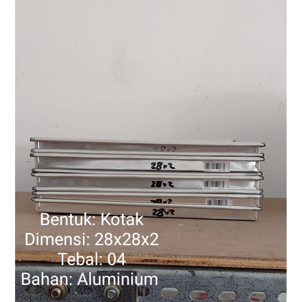 Selamat datang di Tobaku Marem JunioMimin mau memberikan sedikit info tentang toko kami, mohon disimak ya :1. Bila berkenan mohon tanyakan terlebih dahulu stok barang ya2. Bila barang tidak ada akan dikonfirmasi oleh mimin terlebih dahulu sebelum dikirim3. Orderan masuk sebelum jam 14.00 akan diproses di hari yang sama4. Bila terjadi keterlambatan pengiriman akibat overload bagian packing, akan diproses maksimal H+2 dari order ya5. Barang di toko kami, dijamin 100% original, jika tidak garansi uang kembali 100% kak6. Bila terjadi kesalahan kirim atau kekurangan kirim, atau klaim produk rusak, mohon chat mimin yah. Karena barang akan disusulkan dan dikirim ulang tanpa ada tambahan biaya alias FREE. Jangan langsung memberikan rating buruk ya kak, mimin sedih nanti, karena kita juga bisa keliru ya kak, mohon pengertiannya7. Kami akan senang sekali melayani kakak dengan sepenuh hati dan jangan sungkan untuk sekedar menanyakan perihal produk kami ya dan konsultasi seputar baking, kami akan layani penuh cinta kak.Loyang alumunium digunakan sebagai aneka cetakan cake, cookies, dan roti. Aman untuk dimasukkan ke oven karena berbahan dasar alumunium dan cepat panas sehingga membuat cake lebih cepat matang sempurna. Dapatkan loyang dengan kualitas premium dan harga terjangkau hanya di toko kami.Spesifikasi Loyang Alumunium Kotak 28x28x2 Tebal 04- Bentuk : Kotak- Dimensi : 28x28x2- Tebal : 04- Bahan : AluminiumHAPPY SHOPPING, PREMIUM BAKERS C