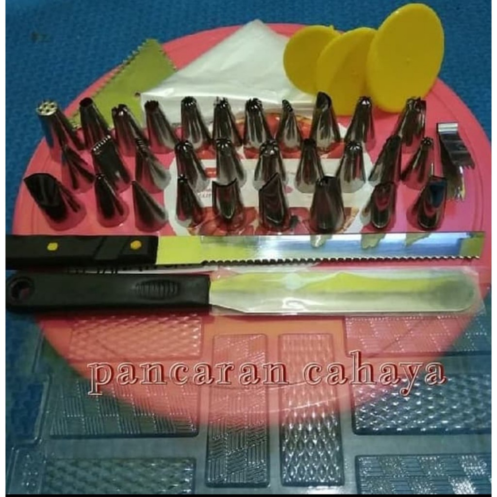 Barang ready silahkan di order kaPaket dekorasi terbaik muraah* 1 cake tray (meja putar Maspion)* 3 paku mawar* 29 spuit basic + 1 alat penjepit kue* 1 spuit rumput* 1 scraper stainless* 1 buah spatula* 1 buah pisau kue dua sisi* 1 pagar coklat* 10 plastik segitigaBeli satu paket lebih murah daripada beli satuan.Barang di periksa terlebih dahulu sebelum di kirim dalam keadaan baikPilih warna meja putar pink, biru, hijauBarang di packing dengan bubble wrap g