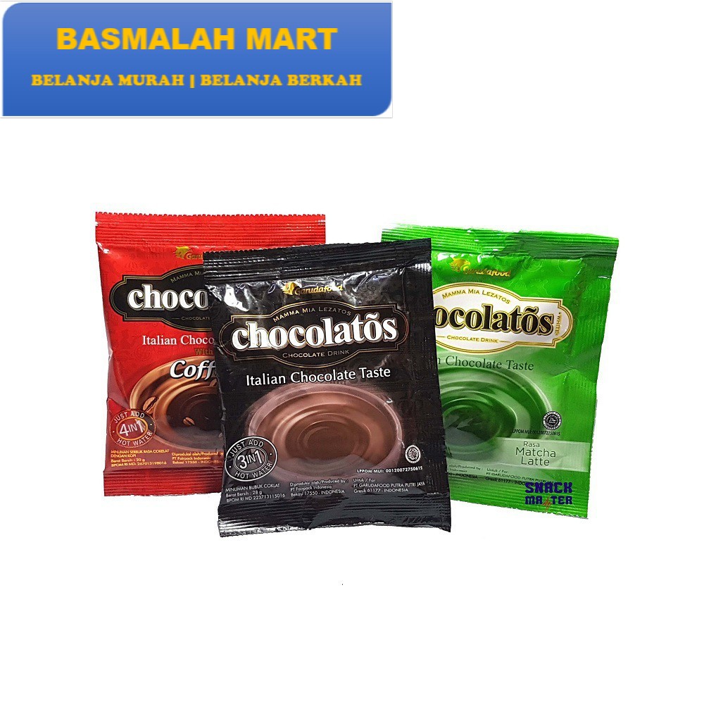 Basmalah MartReady: Acb Jaya MartReady:1. Minuman coklat "Chocolatos Choco Drink" adalah minuman serbuk coklat asli dengan cita rasa Italia.Sangat nikmat diminum saat panas maupun dingin.2. Netto 10x@28g/bks (per renceng)3. Tersedia varian coklat4. Harga tertera adalah harga s