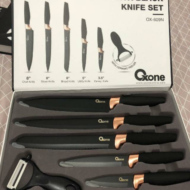 READY STOCK!!! Oxone Onyx Black Knife Set/Pisau Set OX-609N Original 100%Spesifikasi :- Merek: Oxone OX-609N- 100% Original – 6 Pcs Pisau Set– Pisau di lapisi Marble– Sangat tajam– Dilengkapi peller (mata pisau keramik)– Kualitas Stainless anti karat– Desain Elegan– Gagang Pisau yang nyaman dan erat ketika digunakanTerdiri dari : 1pcs chef knife 8 Inch1pcs slicer knife 8 Inch1pcs bread knife 8 Inch1pcs utility knife 5 Inch1pcs paring knife 3.5 Inch1pcs ceramic peelerHigh Qu