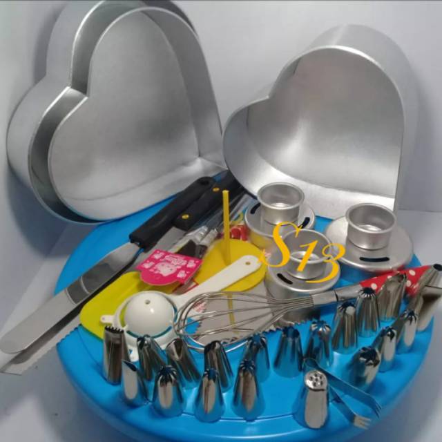 Dilengkapi loyang kue tart bentuk love3 pcs ukuran 18 20 22 cmBahan galvalumIsi1. Meja putar 2. Spuit isi 203. Kocokan telur 4. Donat 1 set5. Paku mawar 6. Lemet 17. Pisau roti 18. Spatula kue9. scrapper stainless 10. cepit nastar 111. Loyang love 3