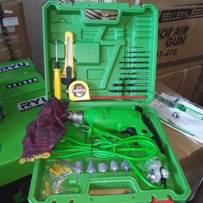 Paket mesin bor tembok ryu RID 13-1 REB dengan assesoris 27 pcs dengan spec :5 bh mata bor tembok 3 , 4 , 5 , 6 , 8mm6 bh mata bor besi 1.5 , 3 , 4 , 5 , 6 , 8mm3 bh mata bor kayu 5 , 6 , 8mm1 bh meteran ukur 2 mtr1 bh pisau cutter1 bh pensil kayu1 bh obeng bolak balik5 pcs mata gerinda batu1 psng sarung tangan kerja1 bh handle bor1 bh fi
